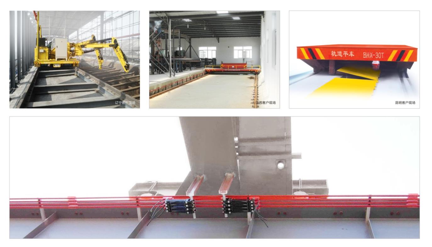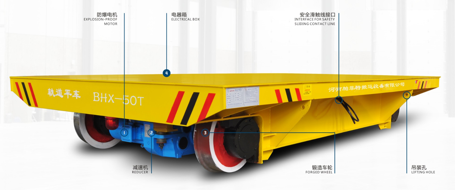 BHX系列是滑触线供电轨道平车,是将交流380V的安全滑触线直接引入平车交流控制系统,来控制平车的启动,停止,前进,后退等。通过平车的移动带动安全滑触线的滑块来实现给平车供电,安全滑触线受安装位置的限制,可以安装在轨道中间或道轨外侧地沟内。为了安全和方便可以在地沟上增加盖板,通过自动翻板装置,来实现地沟内的电源引入轨道平车上,操作系统为低压36V电源控制!