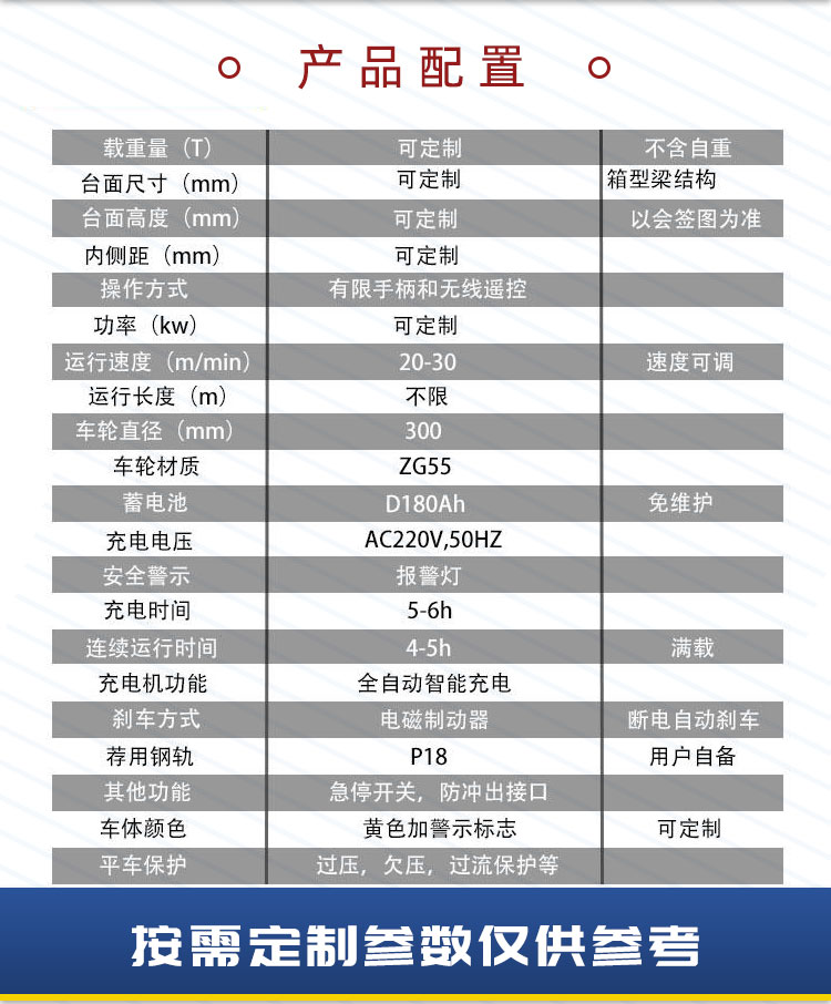 港澳新彩BWP系列无轨电动平车由电源、传动机构、钢结构承重架、转向系统、行走机构、控制模块以及故障诊断模块组成。通常,我们选择蓄电池、 电缆、发电机作为该系列车的电源,电源经过电器控制模块系统,给牵引电机提供电力,实现无轨转运车的启动、停止、前进、后退和转向以及其它功能。该系列车可实现360原地旋转。车上均配有安全警示和安全检测装置,遇到行人或障碍物立即报警并自动停止,配备全自动智能充电机。无轨转运车上还可以加装定位装置、夹紧装置、升降平台等其它辅助装置以满足不同场合的使用需求。该系列车可以装配PLC控制系统,实现完全自动化控制。