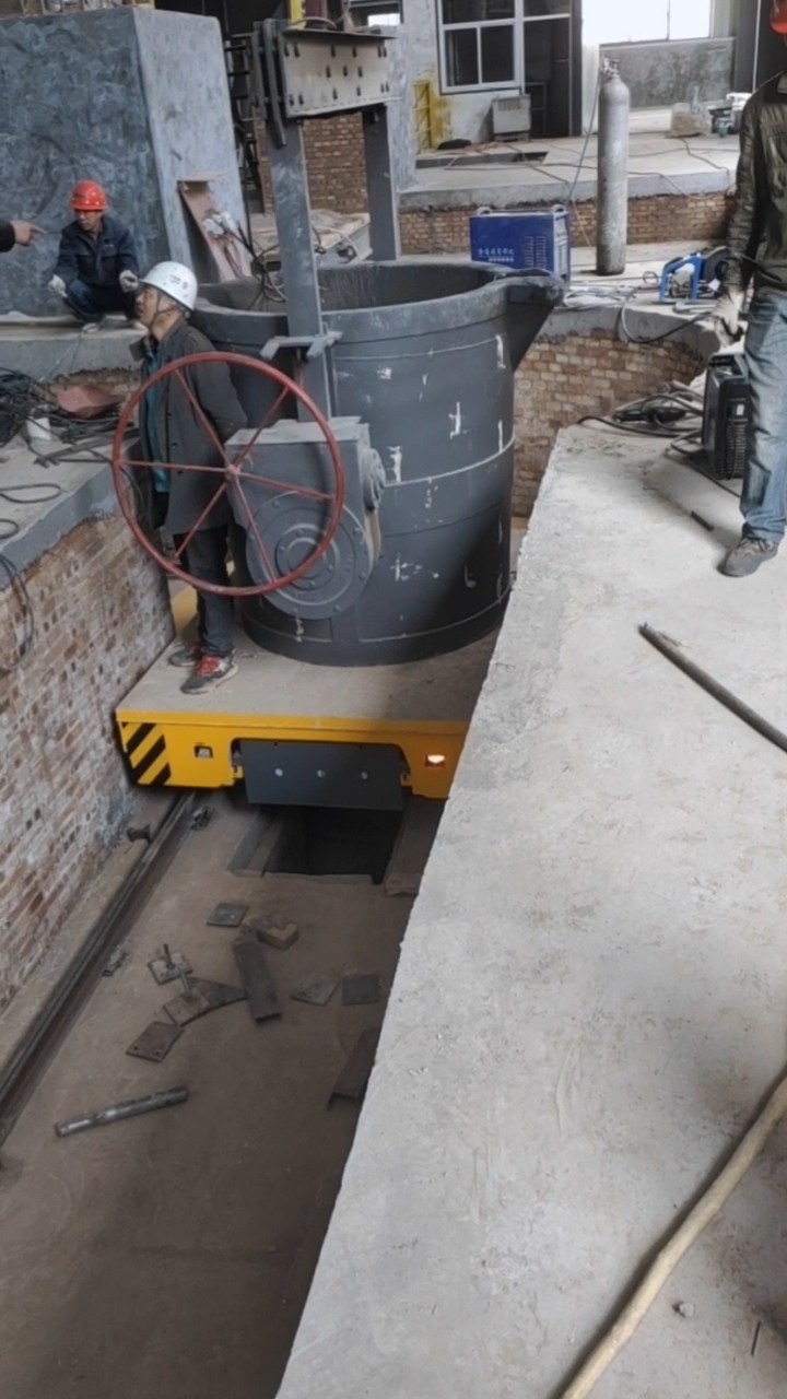 地坑中使用,蓄电池轨道车+转盘配合使用。转盘90°转角(无线遥控操作),蓄电池轨道车运载钢包15t,钢包高温,车子需做台面高温处理(铺耐火土),电器原件及电机驱动防爆处理,倾斜翻倒钢水,防止长时间使用过程中,损坏电器原件及电机驱动,轨道车动力电源(免维护蓄电池1用1备)确保车子动力电源!