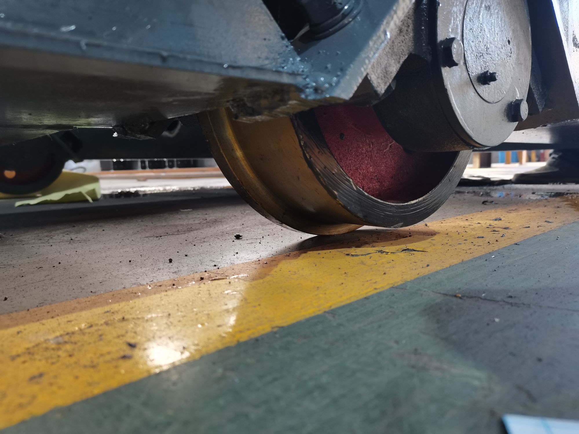 这是客户为终端提供的工程中的一套设备,要处理的事不同直径长度的筒体,车体台面设有电动滚轮架,防窜动端部定位轮,镂空台面方便砂粒堆积,是一套专用定制设备。