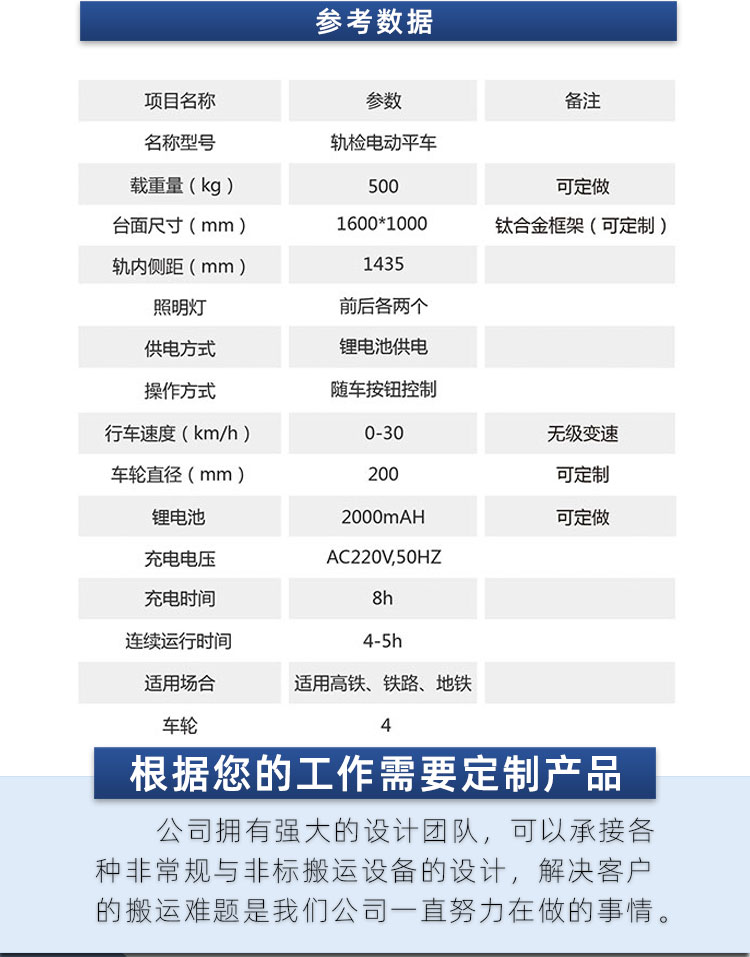 通过锂电池提供动力通过电机带动平车行走,平车设有随车控制按钮,可控制轻车前进、后退、停止、加减变速。平车采用机械式和自动抱闸制动,制动平稳、可靠、使用安全、检修方便。为了保证轨道检测平车运行的安全,在平车的操作按钮上加装了紧急停止按钮,在平车两段设置了声光报警装置。制动系统采用机械式制动,具有失电自动制动功能,可以在手动释放刹车,保证人可以推动平车运行。详细介绍